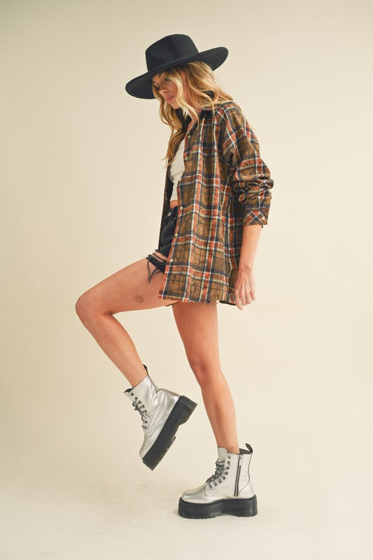 Drape yourself in warmth and style with Laura crafted from washed plaid flannel fabric the boxy silhouette exudes casual comfort, complemented by a modern side step hem. Raglan sleeves ensure ease of movement.