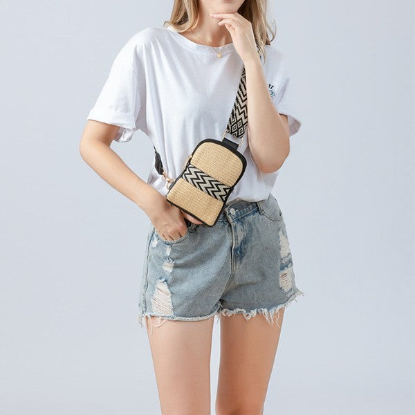 This stylish sling bag combines practicality with eye-catching aesthetics, making it a fabulous choice for those on-the-go. It features a sophisticated woven pattern on the body, complemented by a bold geometric design on the adjustable strap, adding a touch of artistic flair. The bag is compact yet spacious enough to hold essentials like your phone, wallet, and keys with ease. Its versatile design allows for wearing across the body or over the shoulder, providing both comfort and security. Whether you're heading to a casual outing or traveling, this bag seamlessly blends functionality with modern style, making it an essential accessory for any fashion-conscious individual.