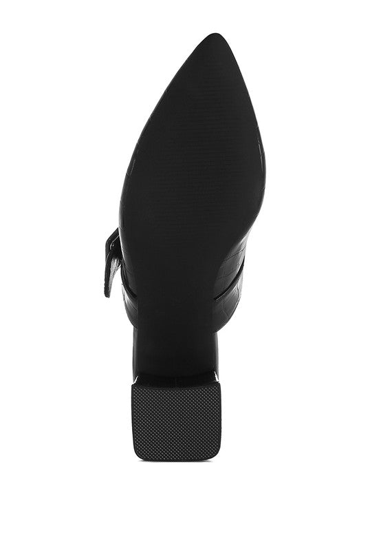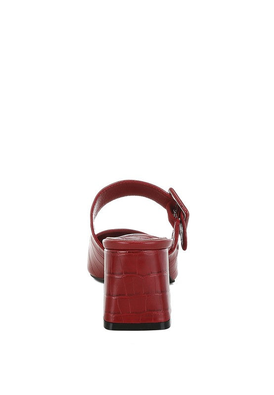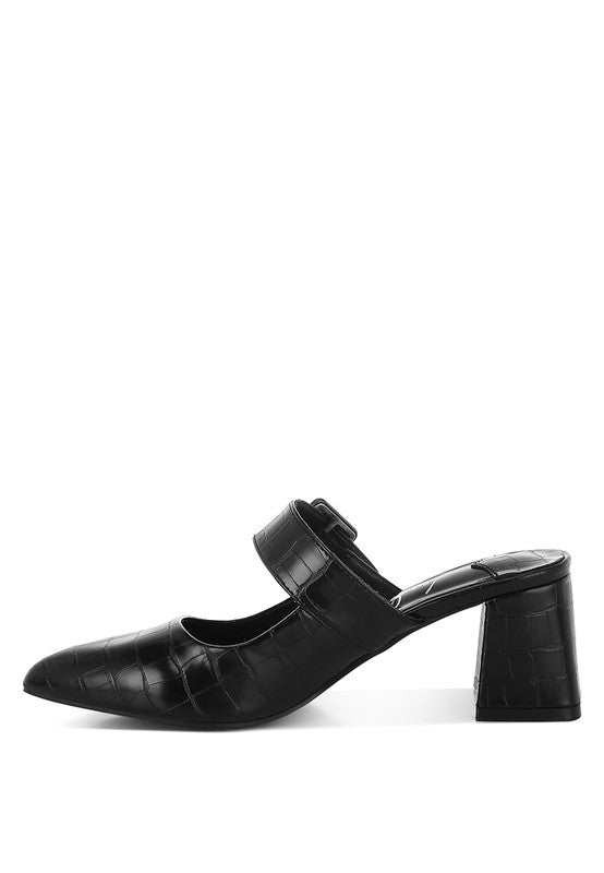 Chic and versatile, the pair of mules have a stylish flair with the croco embossed exterior and the pin buckle strap detail. The mules offer an easy to wear experience and the plush cushion insoles ensure a comfortable walkability experience.